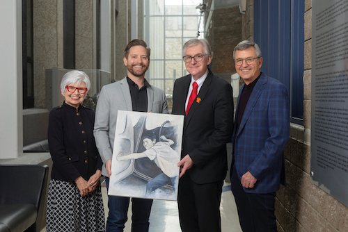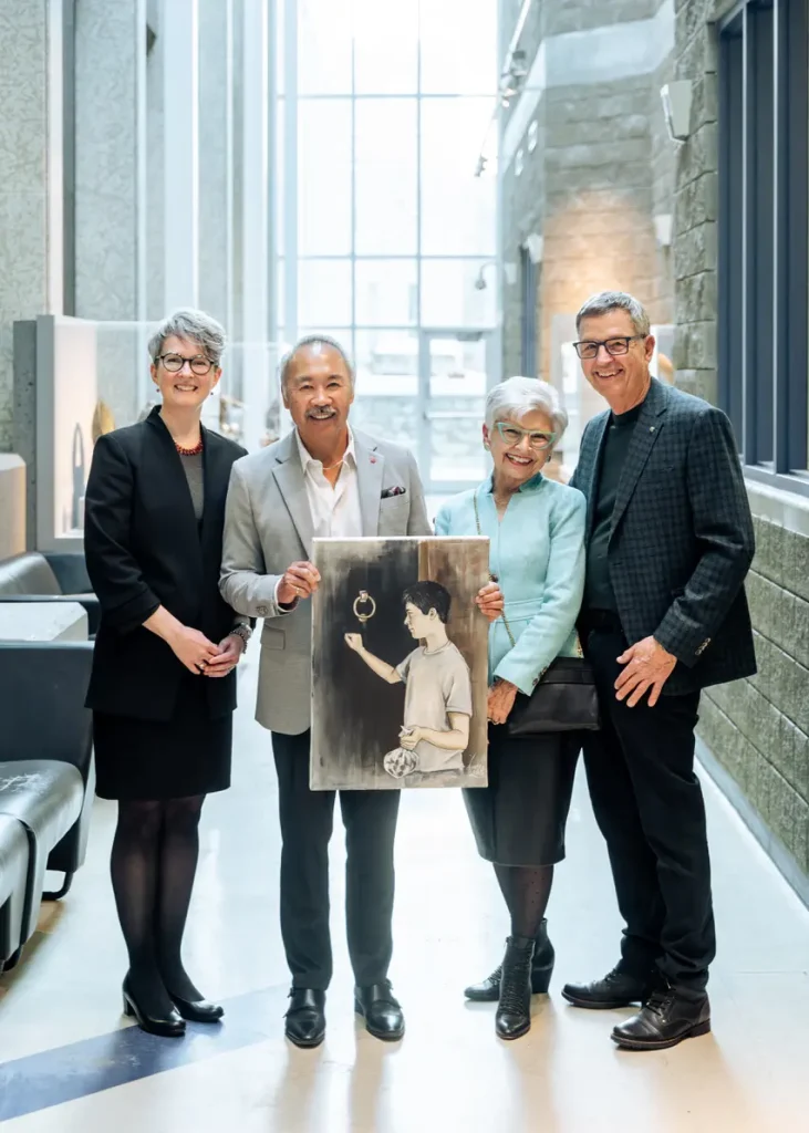 L to R, Dean Keith Willoughby of Edwards School of Business, Mr. Percy Hoff, Maureen Haddock, and Gordon Haddock. The Haddocks presented Percy with a Denyse Klette painting illustrating a story titled “Drums, Not Trumpets” found in the book Get an Even Bigger Wagon written by Maureen. In this story, the boy becomes familiar with the feeling that sweeps over him whenever someone tries to force him to do something.
